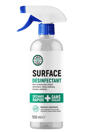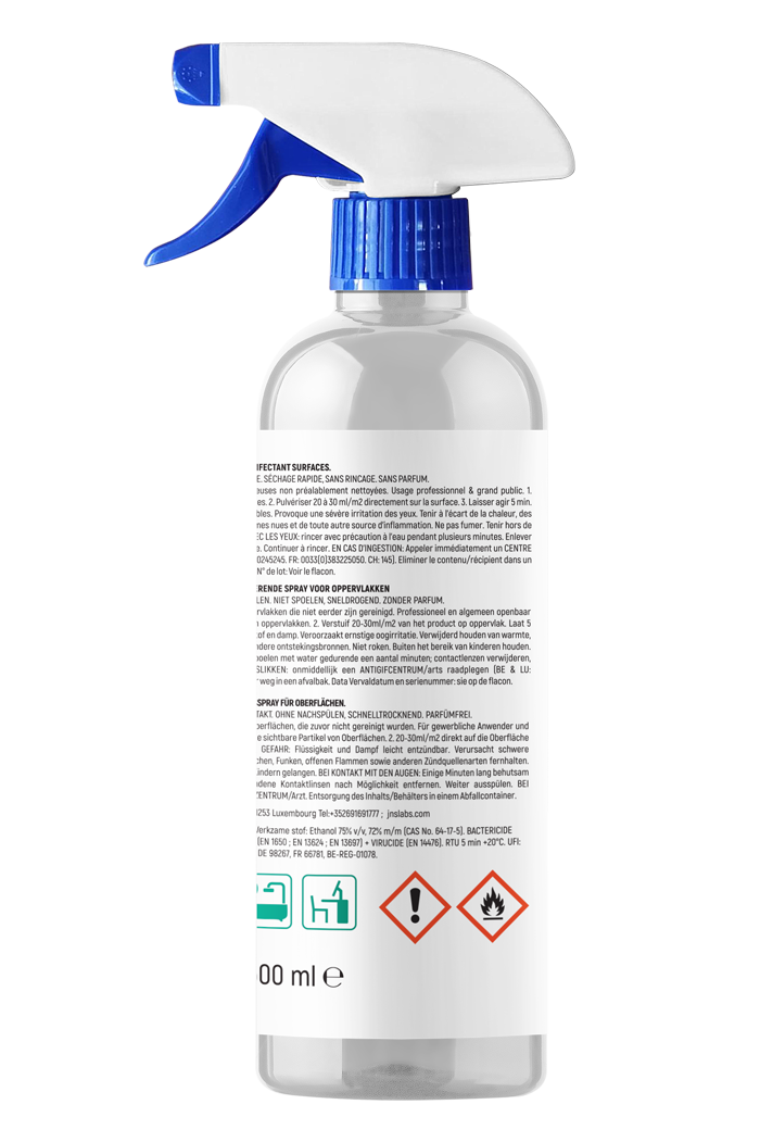 JNSLABS SURFACE Disinfectant Spray is a natural disinfectant for use on all types of surfaces, including food contact surfaces. The antibacterial action of the natural ethanol formula both disinfects and refreshes. The ingredients are 99.8% natural and contain no animal substances. Ideal for disinfecting doorknobs, phones, computer keyboards, tables or food contact surfaces in kitchens. For professional and public use. Bactericide according to standard EN1276, Virucide according to EN14476.