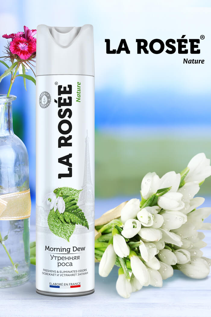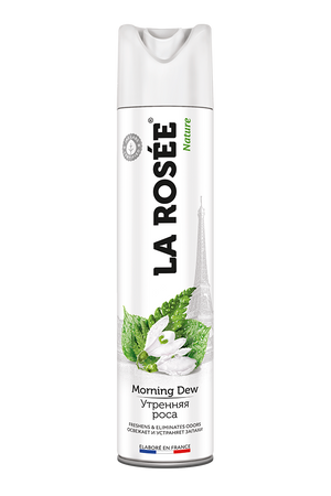Feel the freshness of the early morning dew! The delicate freshness of greenery is evoked with every spray of the aromatic freshener LA ROSÉE Morning Dew. LA ROSÉE air fresheners are made with natural ingredients and fragrances from France. LA ROSÉE Morning Dew does not stain and can be used on textiles. Its natural formula eliminates odours and gives an immediate sensation of freshness. LA ROSÉE is recommended for kitchen, offices, toilets, pets litter and as an ambiance perfume.